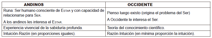En este contexto, se pretende formular el problema, más que la solución, desde la visión indígena y el valor actual que este tiene, para así confrontar la teoría racional occidental del «pienso, luego existo» (Cogito Ergo Sum) de Descartes y nuestra sabiduría, sapiencia indígena andina, de Abya Yala. Para una mejor comprensión de las diferencias en los pensamientos podemos ver el siguiente cuadro comparativo: