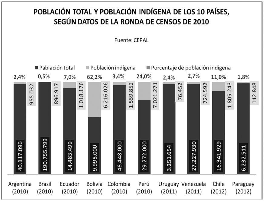 Considero que la sola enunciación de este tema motiva a conocer el porcentaje de población indígena de los 10 países del continente latinoamericano y caribeño, como se puede observar en el cuadro siguiente.